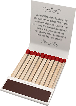 Liebevoll gestaltete Faltkarte mit Geschichten und Gedanken zu Weihnachten, dazu ein Zündholzbriefchen. Eine unaufdringliche Einladung für Verwandte, Freunde, Nachbarn, Kollegen oder die ganze Gemeinde, sich auf besondere Weise der Weihnachtsbotschaft zu nähern.