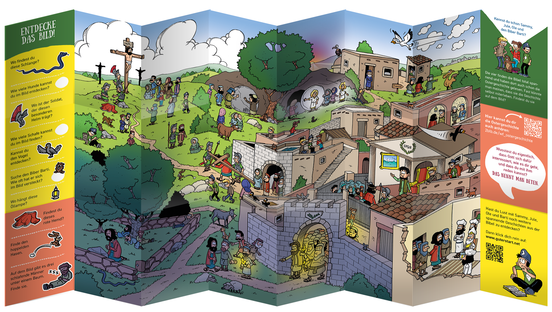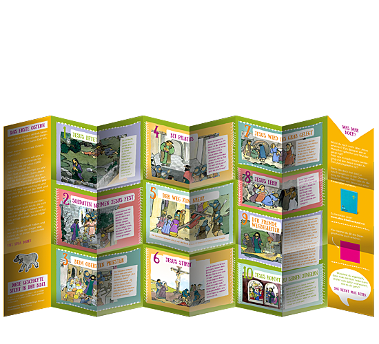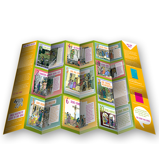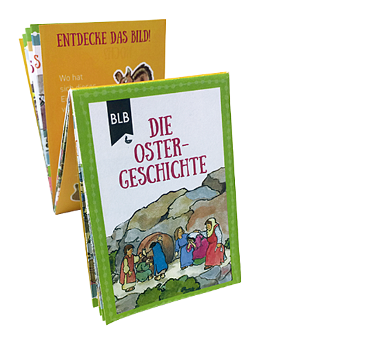 Das ansprechende Wimmelbild lädt Kinder zum Entdecken der Ostergeschichte ein. Auf der Rückseite wird diese anhand von sechs Bildausschnitten kindgerecht erzählt. Mit lustigen Suchaufträgen. Der Flyer eignet sich wunderbar zum Verteilen bei missionarischen Aktionen.