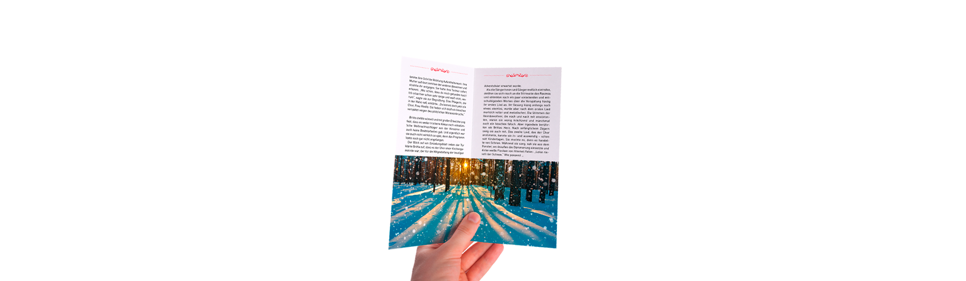 Schicken Sie mit Ihrem Weihnachtsgruß die frohe Botschaft der Bibel an Ihre Freunde und Verwandten: Unsere beliebten Grußkarten enthalten eine fröhliche oder besinnliche Weihnachtsgeschichte, die zum Nachdenken anregt. Inhalt: Gabi möchte nur den Altar für den Advent schmücken, doch eine obdachlose Frau in der Kirche lässt ihr keine Ruhe. Erinnerungen an eine beängstigende Begegnung kehren zurück, Angst und Vorurteile flammen auf. Ist diese Besucherin eine Bedrohung oder einfach nur einsam? Am liebsten würde Gabi sie einfach ignorieren, doch da blitzt ein Gedanke in ihr auf. Hat Jesus sich nicht gerade den Ausgestoßenen zugewandt? Geheftet, DIN A6, 10,5 x 14,8 cm,12 Seitenplus Briefhülle und Karte mit Bibelvers:Jesus Christus war in allem Gott gleich, und doch hielt er nicht gierig daran fest, so wie Gott zu sein. Er gab alle seine Vorrechte auf und wurde einem Sklaven gleich. Er wurde ein Mensch in dieser Welt und teilte das Leben der Menschen. (Philipper 2, 6-7)
